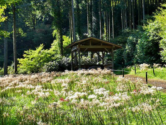 白い彼岸花のお花畑の中には「休み処 もんじゅ」と看板が掲げられた東屋のような休憩所もありました。