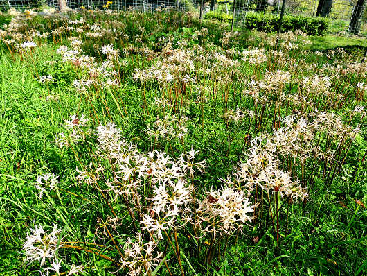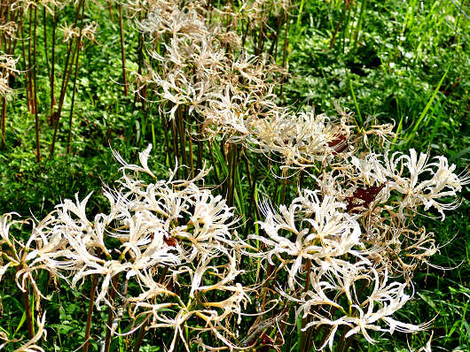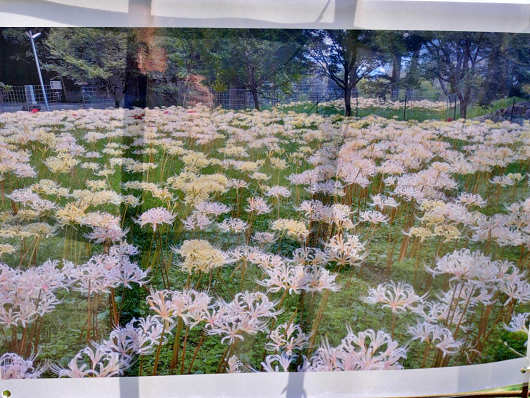 満開の時季に撮影したと思われる白い彼岸花が写っていました。今回ここを訪れた時にはすでに最盛期を過ぎていて、半分ほどは枯れていましたが、満開の時にはこんなにきれいなんですね。来年はしっかりと開花状況を調べてから訪れたいですね。
