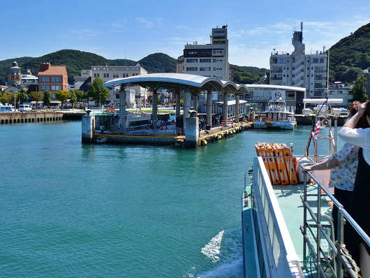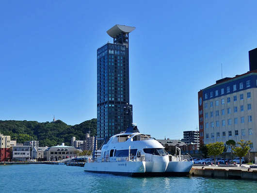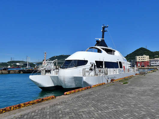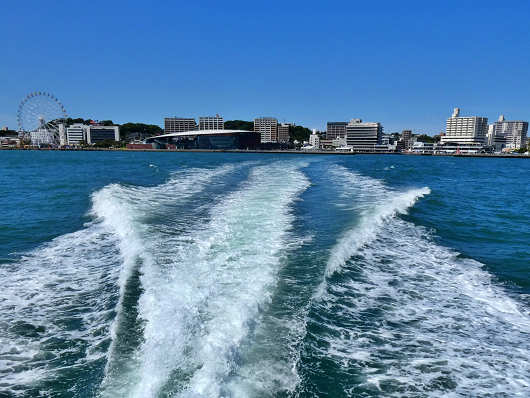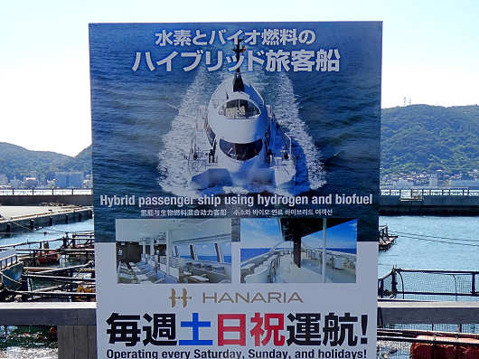 船尾から眺めたらこんな感じです。この船のことは全く知らなかったので、帰ってからじっくりと調べたら、この船は次世代エネルギーといわれる水素と、使用済み食用油から造られたバイオディーゼル燃料を使用した環境にとても優しい日本初のハイブリッド旅客船でした。