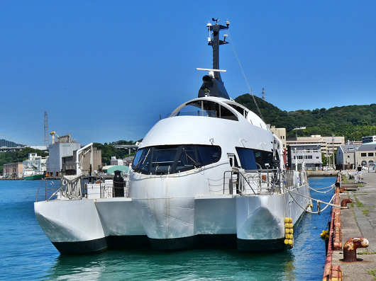 正面から眺めると船体が二つある双胴船(カタマラン)のようでしたが、船体中央部だけを見ると翼の無い旅客機って感じで、どう見ても船には見えないですね。