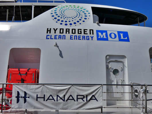 横へ廻ってみると船体には「HYDROGEN CLEAN ENERGY(水素 クリーン エネルギー」と、商船三井の略号の「MOL」と書かれていました。そして手摺には船名の「HANARIA(ハナリア)」と書かれた横断幕も掲げられていました。