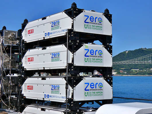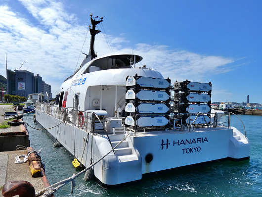 船尾には普通の船では見られない不思議なものが4段2列積まれていましたが、これが水素燃料なんでしょうか?ちなみに船名の「HANARIA(ハナリア)」とは「HANA(華)」と「ARIA(奏でる)」を組み合わせた造語だそうですが素敵な船名ですね。