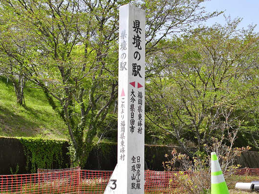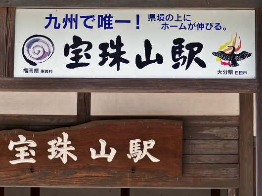 駅舎を通り抜けて振り返ると、停車した電車からよく見えるように、この様な看板が掲げられています。宝珠山駅は九州で唯一のホームの上に県境(大分県と福岡県)がある駅なんですよね。