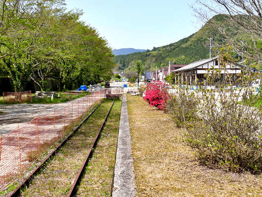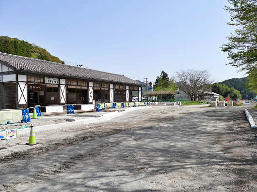 前回ここを訪れたのは豪雨災害の翌年の2018年で、その時はまだレールが残っていましたが、今回訪れてみるとレールは完全に撤去されて、駅舎の前は広場のようになっていました。