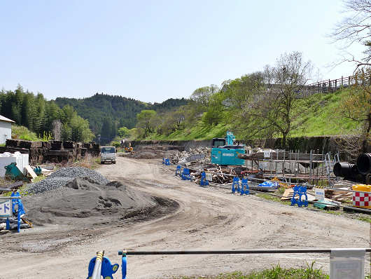 宝珠山駅から国道211号を少し戻って、舗装工事の行われていたところから眺めた宝珠山駅方面です。地元テレビや新聞ではバス専用路線の「BRTひこぼしライン」は8月28日に開通すると報道されていたので、開通してBRTが走るようになったらまた訪れて、どんなバスが走っているのか見てみたいし、ついでに「夜明駅」の見物もしてみたいですね。