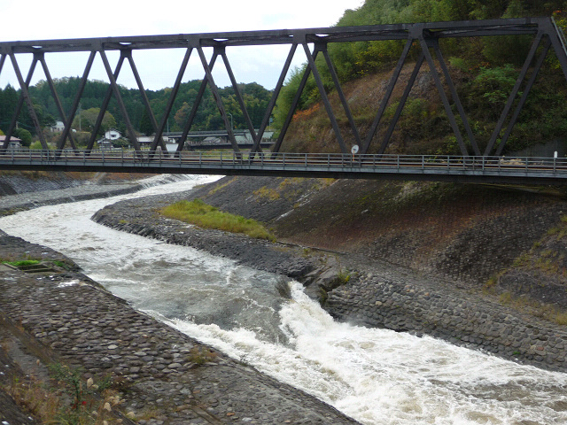 大分と熊本を繋ぐJR豊肥線の鉄橋とその下を流れる稲葉川です、前日からの雨の影響でしょうか?すごい濁流となっていました、今は河川改修が進んでいますが、ここは背後に祖母山系などの山々があり過去には何度も大水害が発生した事があるそうです、