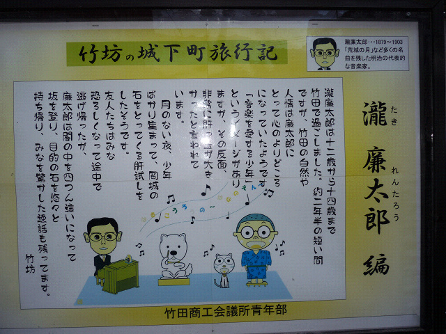 こんな看板もありました、へぇ~滝廉太郎って竹田の出身じゃないんだね、しかも竹田には2年半しか住んでなかったんだ、それなのに岡城址をイメージして荒城の月を作曲したんだから、よっぽど印象深かったんだろうね、滝廉太郎は24歳の若さで大分市内で亡くなったんだよ、終焉の地の碑が大分市遊歩公園にあるから ここ をクリックしてみてね、