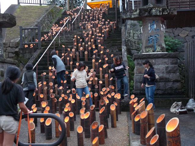 もう完全に真っ暗になりました、竹灯篭が坂の上へと続いて灯っています、