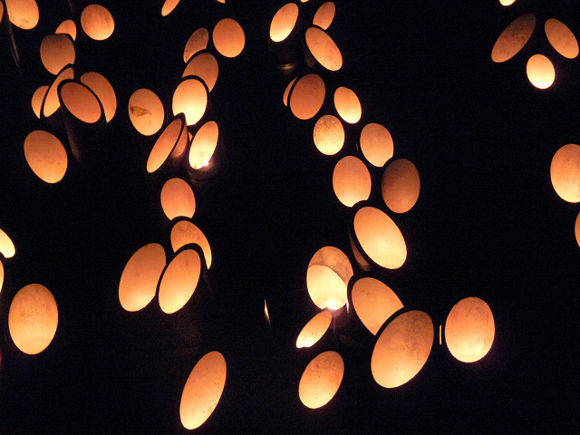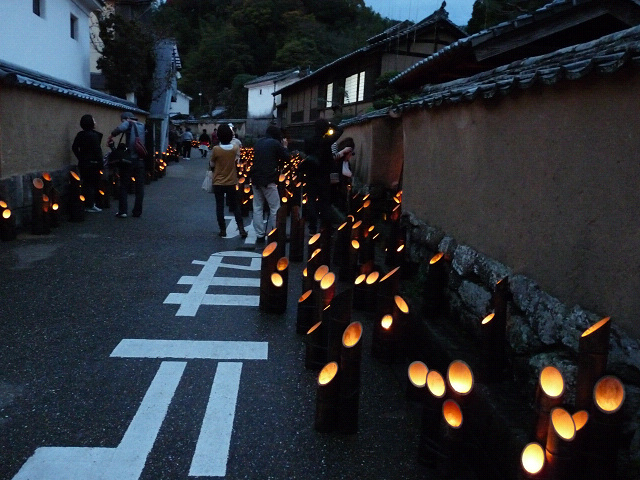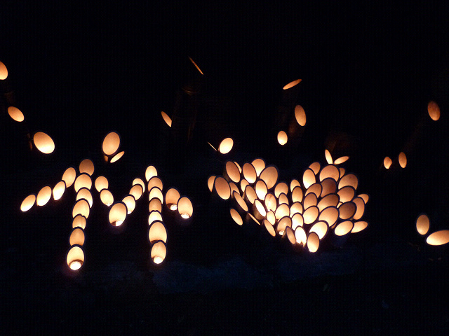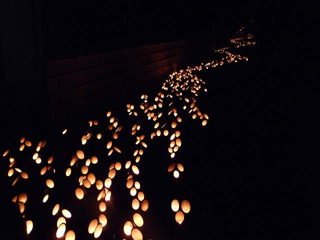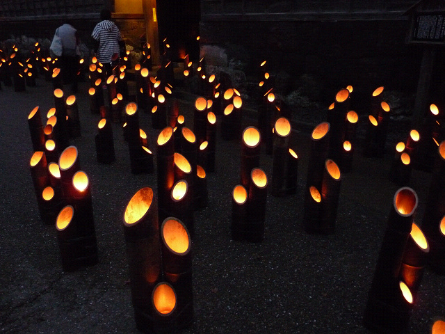 かなり暗くなってきました、竹灯篭の明かりがきれいに見えるようになってきたね、