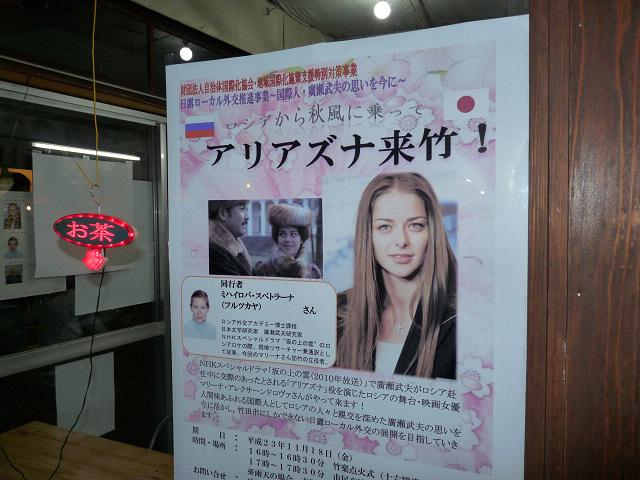 そういえば、NHKドラマ 『坂の上の雲』 でロシア駐在武官時代の廣瀬武夫の恋人アリアズナ役を演じたロシア人女優が来日して、廣瀬武夫を祀ってる廣瀬神社にお参りしたって、18日のNHKの全国ニュースで報道されてたよね、