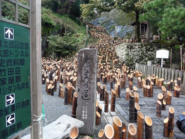 ここは十六羅漢だよ、階段の上までものすごい数の竹灯篭が置かれてるよ、暗くなるのが楽しみだよね、