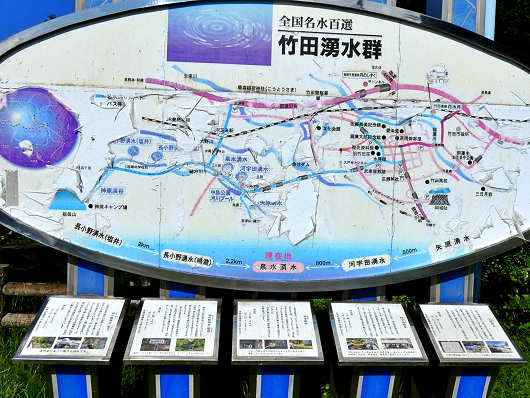 これが入田地区(にゅうたちく)にある5ヵ所の湧水スポットです。ここは竹田湧水群を代表する観光客にも人気の湧水スポットで、「入田湧水群」と名付けられています。でも矢原湧水だけは県道8号沿いじゃないので今回は寄りませんでした。