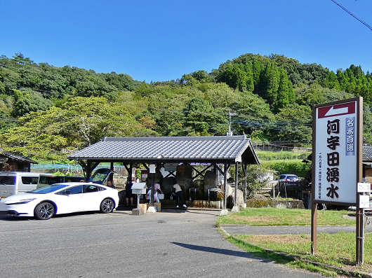 まず最初に寄ったのは「河宇田湧水」です。ここは駐車場が完備されていて、湧水汲み場に車を横付けできるので、観光客などには一番人気の湧水スポットで、いつも大勢の人たちで賑わっています。