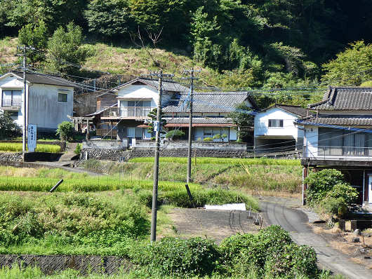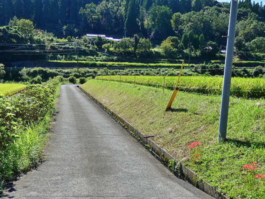 ここは湧水汲み場まで集落内の狭い道が続いていて、駐車場もはっきりしないので、県道から望遠で撮影しただけですが、集落の奥のうっそうと樹木が繁ったところに「鳴滝神社」があって、岩肌を流れるように水が湧き出しているそうです。そしてこれから向かう「長小野湧水(塩井)」は、ここを左へ1㎞ほど行ったところにあります。