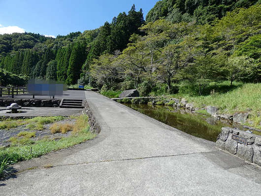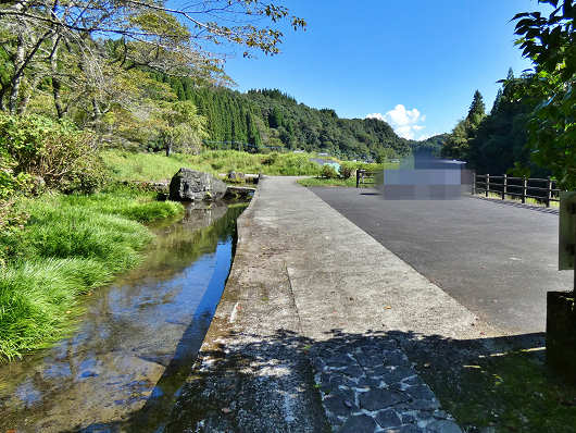 看板の先から振り返って眺めた景色です。何も無いような山の中にポツンと整備された駐車場があって、その前を湧き水が流れていました。ここで水遊びをしても良さそうですね。