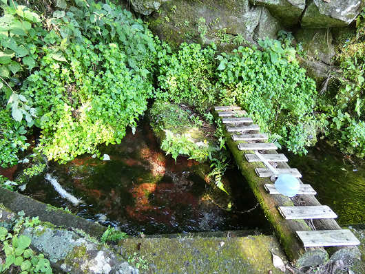 ここが長小野湧水(塩井)の水源(水汲み場)です。水源には板が渡されていて、この板を渡って、その先にある石の上から水源の水を直接を汲むようでした。