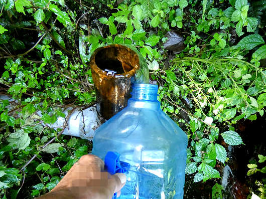 水源の左奥には湧水が湧き出している太いパイプもあったので、私はここから水を汲みましたが、このパイプからはかなりの量の水が出ていたので、このパイプの先に細いパイプで蛇口のようなものを付ければ、水が汲みやすくなるのになぁと思いました。