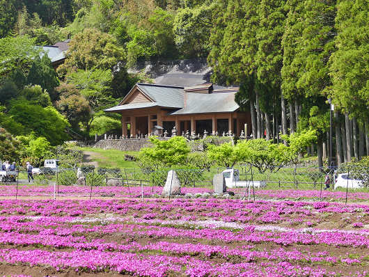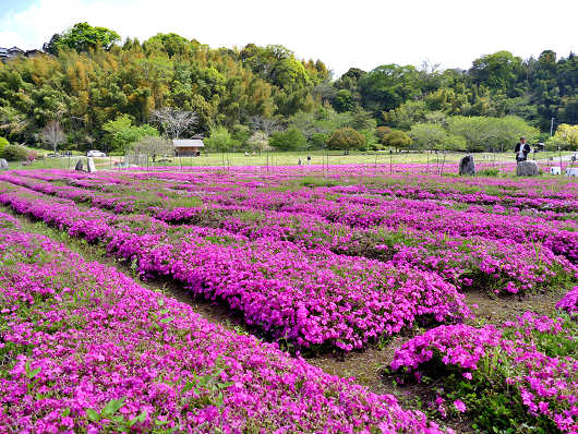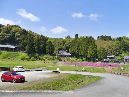 ここが「臼杵石仏公園」です。手前に車が停まっているところが駐車場で、臼杵石仏(摩崖仏)は奥の樹木が繁ったところにあります。画像の中央に見える建物は「ホキ石仏第二群」の覆い屋で、左端に見える建物は「古園石仏」の覆い屋です。そして「ホキ石仏第一群」と「山王山石仏」が樹木に隠れるようにあって、芝桜はその手前に植えられています。