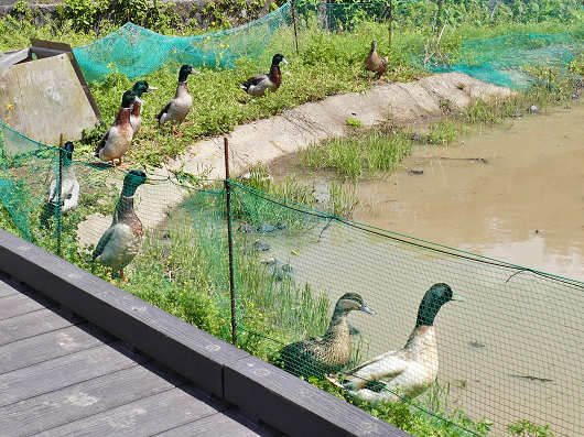 水の張られた畑へ行ってみると、9羽のカモが並んで水面を眺めるように立っていました。そして田んぼの中では1羽のカモが泳いでいたので、全部で10羽のカモがいましたが、昨年の7月にハスの鑑賞に訪れた時にいた子ガモたちが成長したんでしょうか?ハスの花が咲くのはまだ三か月ほど先ですが、ここのハス畑はとても見事なので今から開花が待ち遠しいですね。