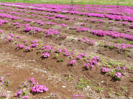 ここの芝桜は見る角度によってはとてもきれいですが、所々この様にまばらな部分もありました。広い畑に植えられているので手入れも大変だろうし、何よりも無料で観賞できるので文句は言えませんよね(笑)