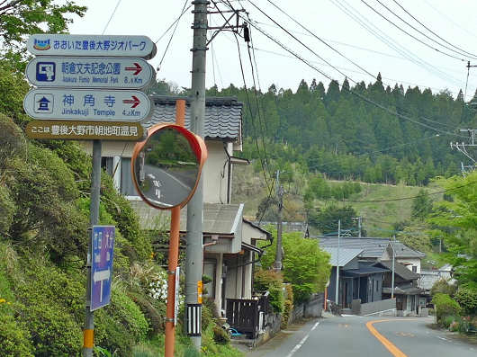 神角寺は豊後大野市朝地町の山深いところにあって、国道57号経由などいくつかのルートで行けますが、今回は「道の駅 のつはる」の前を走る国道442号を経由して行きました。国道442号から神角寺へと続く山道の入口には標識もありますが、初めて訪れる人だと見落としてしまいそうな小さな標識なんですよね。