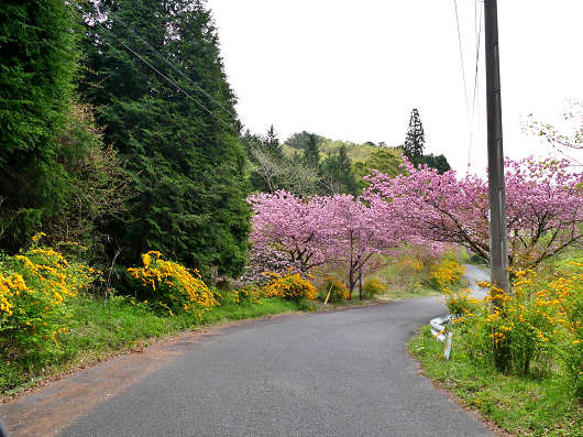 狭い山道へ入ってしばらくすると、道路の両側には黄色い花が咲いて、その先には満開の八重桜が見えてきました。
