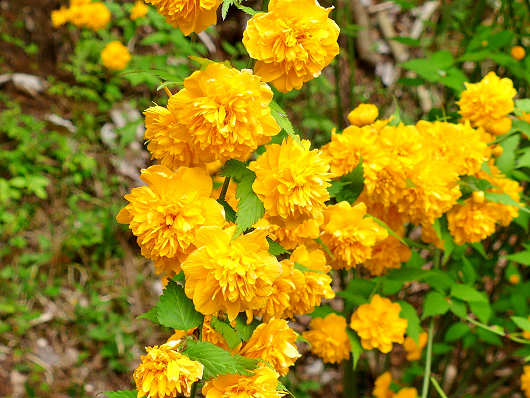 黄色い花は「ヤマブキ」ですが、鮮やかな黄色(山吹色=黄金色)をしていて、ちょっと薄暗いような道路沿いにたくさん咲いていました。このきれいな花を見たら、もうシャクナゲは見なくてここから引き返してもいいかな?って思えるほど見事でした(笑)