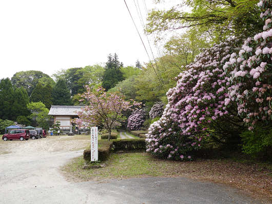 ちょっと遠回りをしましたが、神角寺へ到着しました。昨年ここを訪れた時はちょっと時季が遅かったので、入口にあるシャクナゲの巨木はすっかり花が落ちていましたが、今回はちょうど見頃のようで、満開と思えるほどたくさんの花が咲いていました。