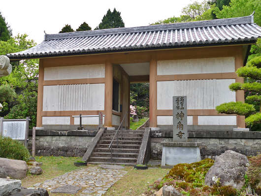 ここが神角寺の山門です。ここには国指定重要文化財で、高さ2.5mの一対の木造金剛力士立像が安置されています。