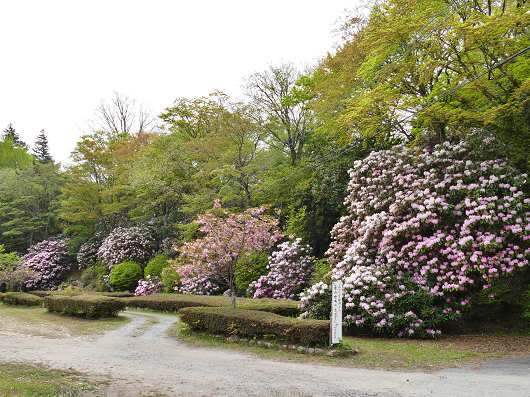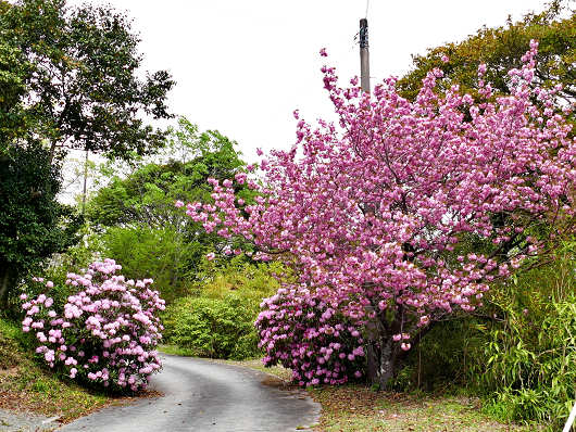 シャクナゲの観賞をしたら神角寺のある山を下りますが、駐車場を出てすぐのところには道路に張り出すように枝を広げたシャクナゲと、その上には満開を迎えた八重桜が咲き誇っていました。車でここを通るといつも側面がシャクナゲの枝に触るんですが、入口の門柱のようなシャクナゲなのであえて剪定を行ってないんでしょうね?