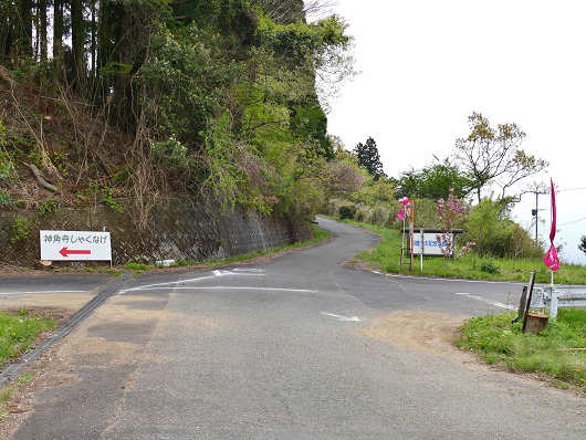 さらに山道を登って行くと十字路に出ます。普段は神角寺へ行くにはこの道を真っすぐに進みますが、ここから先は道路が少し狭くて、シャクナゲの咲くこの時季は一方通行になっているので、この十字路を左折してちょっと遠回りをします。この十字路を右折して山を下って行くと「朝倉文夫記念公園」を経由して国道57号へと出ます。