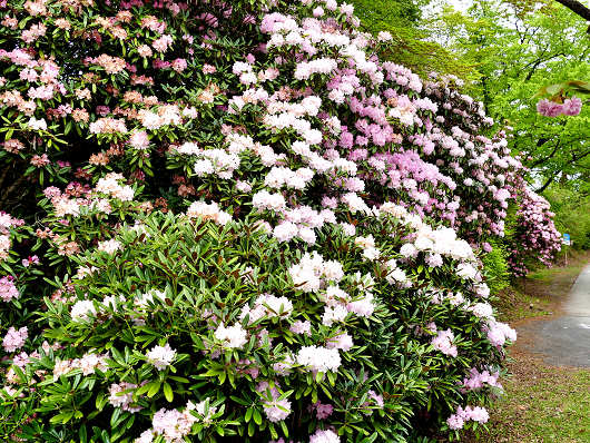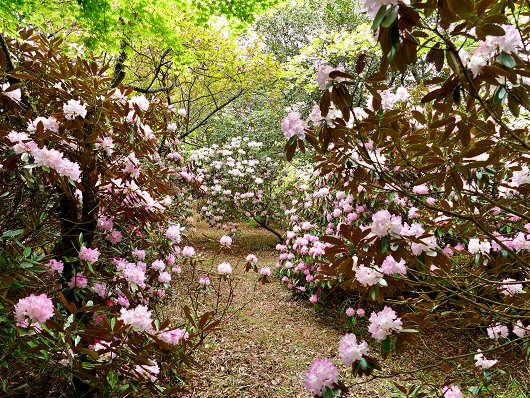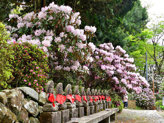 山門の横の参道?には樹齢百年以上と言われるシャクナゲの巨木が何本も植えられていますが、これらの巨木も花がびっしりと咲いて満開を迎えているようでした。