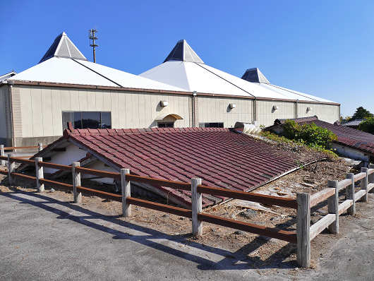 こちらは屋外で保存されている被災家屋です。奥に見えるのは道の駅の建物で、手前の2棟が被災家屋です。