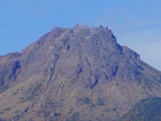 雲仙普賢岳(平成新山)の山頂付近を望遠で撮影すると、普賢岳の大噴火から30年以上経っても山頂付近の溶岩ドームには草木が全く生えていないように見ました。