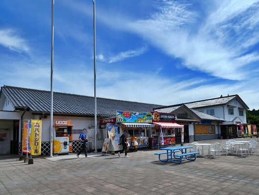 川登SA上りはリニューアルをしていないので、見た目が昔ながらのSAって感じで、建物前の広場には飲食・休憩用のテーブルなども置かれていました。一見すると道の駅って感じもしますね。
