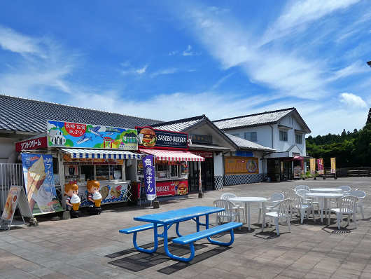 川登SAは焼き物の産地の佐賀県武雄市にあるので、建物に向かって右端には橋が架かった池があって、その周囲にはズラリと焼き物のオブジェが並び、橋を渡った先には陶土を砕く「唐臼小屋」などがありますが、今回訪れてみると立入禁止になっていました。ここには木陰のベンチなどもあって散歩や休憩にとてもいいところだったんですよね。
