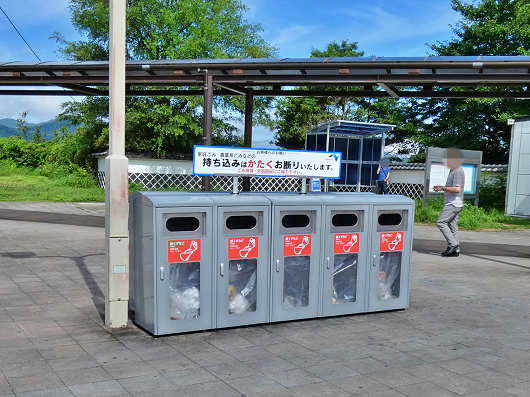 そして大村湾PAでは見なかった缶、瓶などの分別ボックスが、建物前広場の真ん中に置かれていました。