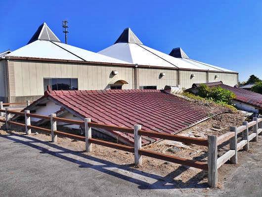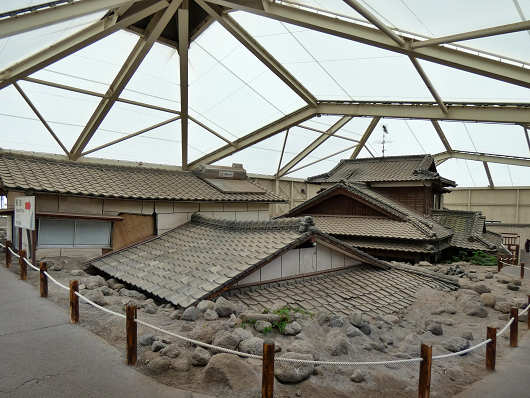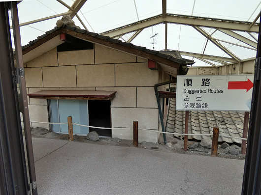 ここがドームの入口です。ここではドームの中央部に3棟の被災家屋が保存されていて、中央の1棟のみが数百m離れた場所から移築された家屋で、これらの家屋を取り囲むように見学通路があります。