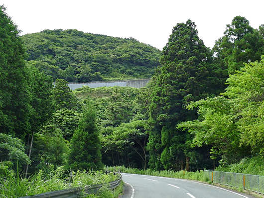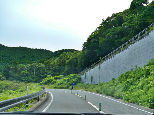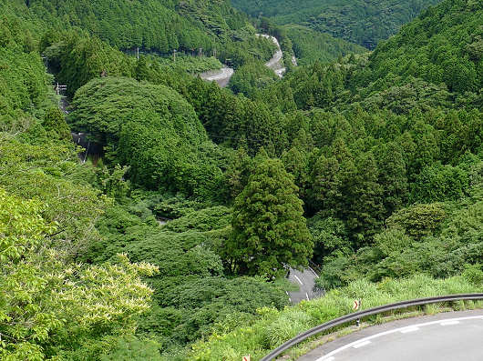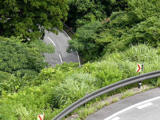 棚田展望台を出発してもすぐに急カーブはありませんが、前方の上部にはこの先の連続する急カーブを予感させる道路の擁壁が見えています。