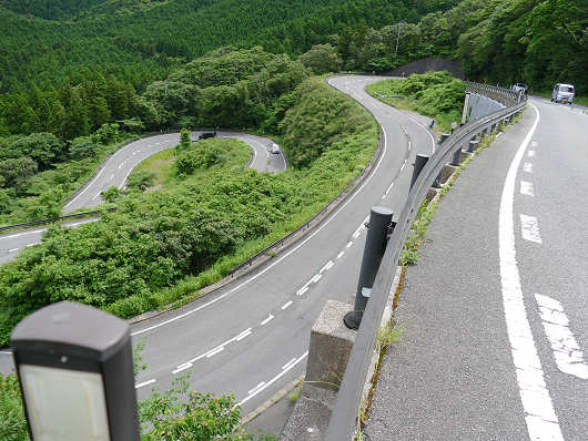 急カーブが連続するところには駐車帯も無いので、数百mほど離れたところに車を停めて、歩いてこの急カーブを見に行ってみました。この急カーブが連続する道が「雲仙ドラゴンロード」です。誰が名付けたのかは知りませんが、まさに龍の姿って感じでよく思いついたものですね。