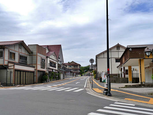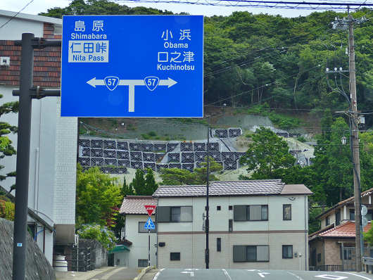 交差点から眺めた雲仙温泉の街並みです。この辺りは雲仙温泉の端になるので、雲仙地獄などがある雲仙温泉の温泉街は、交差点を右折して小浜方面へ下ったところにあります。県道128号は時間と距離を短縮するには便利な県道ですが、雲仙温泉も小浜温泉も通らないので、地元民のための道路って感じで、観光客がこの県道を走ることはあまり無いでしょうね。