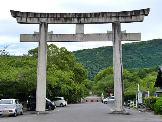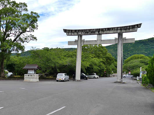 国道57号を左折すると大きな鳥居があって、その周囲が広い無料駐車場になっていました。ここは初めて訪れるところで、事前に何も調べませんでしたが、鳥居が建っているってことは神社があるんでしょうね。