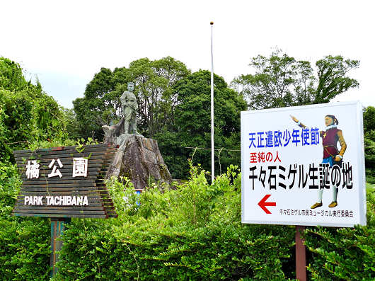 車を停めたらさっそく周辺を見て廻りました。大鳥居のすぐ横には「橘公園」の看板の他に「天正遣欧少年使節 至純の人 千々石ミゲル生誕の地」と書かれた看板もありました。 天正遣欧少年使節は九州のキリシタン大名の名代として派遣された4名の少年ですが、そのうちの一人はここ千々石町の出身なんですね。そして奥のほうを見ると銅像も建っていました。