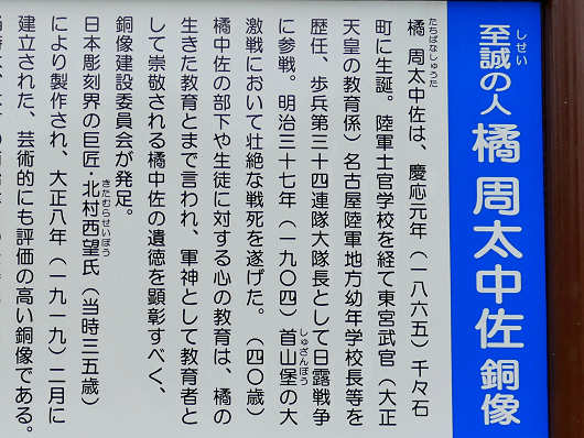 銅像の説明書きです。これを読むとこの銅像の人物は千々石町出身の橘周太陸軍中佐で、大正天皇の教育係などを経て、日露戦争に参戦して壮絶な戦死を遂げて軍神となったなどと書かれていました。