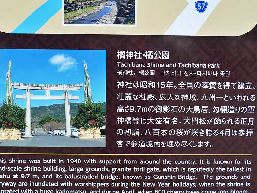 ここにはこの様な説明板もあって「橘神社」と書かれていたので、橘周太陸軍中佐は軍神となって橘神社の御祭神となっているようですね。そして大鳥居は御影石造で9.7mもあって九州最大の大きさと書かれていました。この説明板には書かれていませんが、橘神社ではギネスに認定された高さが14m以上もある世界一の門松が毎年末には登場するそうです。