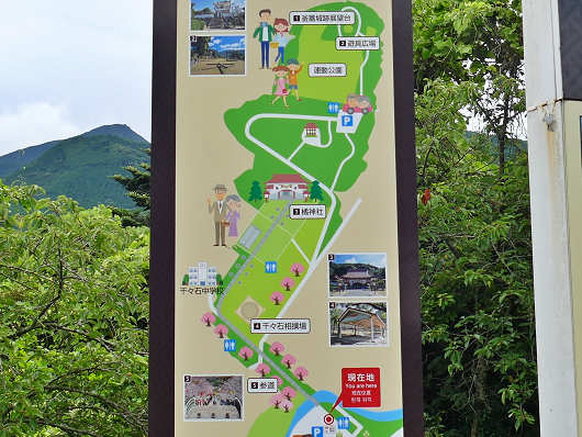これが橘公園(橘神社)の案内図です。これを見ると橘神社の拝殿まではかなりの距離がありそうで、この日も熱中症警戒アラートが出ていたので、旅行の初っ端からいきなり熱中症になっても困るので参拝は断念しました(笑)