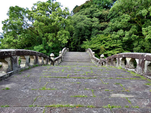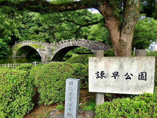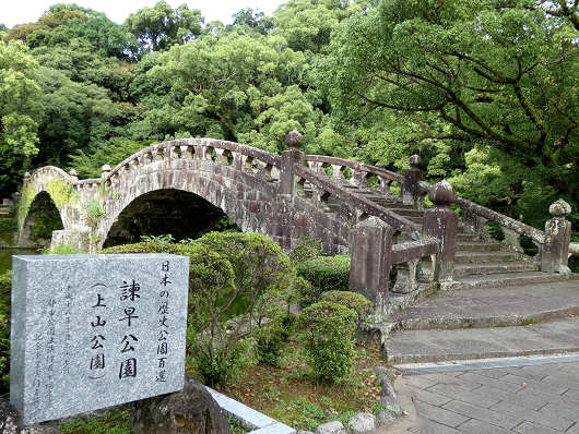 これから眼鏡橋を渡りますが、橋のたもとには「諫早公園(上山公園)」と刻まれた石碑がありました。上山公園はかつて諫早城があった丘陵全体を公園として整備したもので、120haほどの広大な面積がありますが、諫早公園はその一部になるそうです。