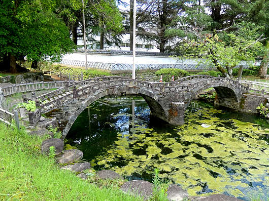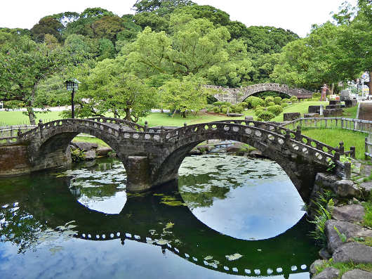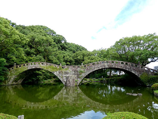 ミニチュアの眼鏡橋とその向こうに見える本物の眼鏡橋です。池に架かるミニ眼鏡橋は池面に逆さミニ眼鏡橋も写っていて、両方を合わせるとメガネそのものですね。眼鏡橋の奥のほうには樹木がこんもりと繁ったところがありますが、ここは標高50mほどの丘陵になっていて、ここに諫早城の本丸跡などがあります。