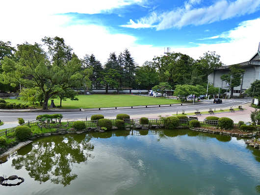 眼鏡橋の上から眺めた諫早公園です。画像の右側に樹木に隠れるように数台の車が見えていますが、ここが諫早公園の駐車場です。右端にわずかに写っている建物は諫早市体育館で、高城神社はその前にあります。