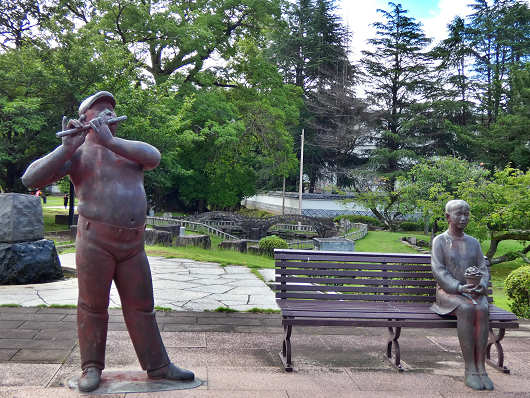 眼鏡橋の道路を挟んだ向かい側の広場には上半身裸で横笛を吹くおじさんと、ベンチに座った少女の像(モニュメント)がありました。これは彫刻家の黒川晃彦さんのアート作品で、全国に点在するそうですが、九州では福岡市天神と長崎市内にもあってサックスを演奏しているそうです。
